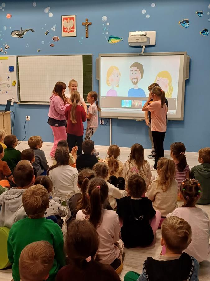 Uczniowie klasy trzeciej przygotowali scenki pokazujące, że słowa i zachowanie mogą kogoś zranić, ale także jak okazać pomoc i empatię.