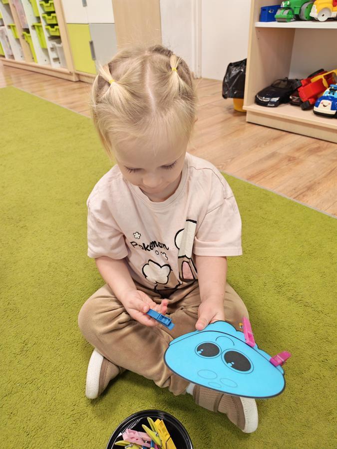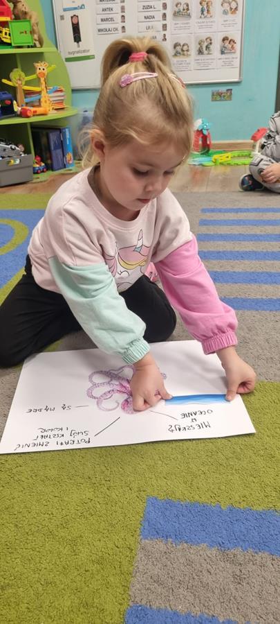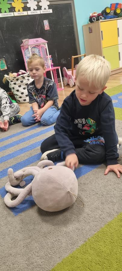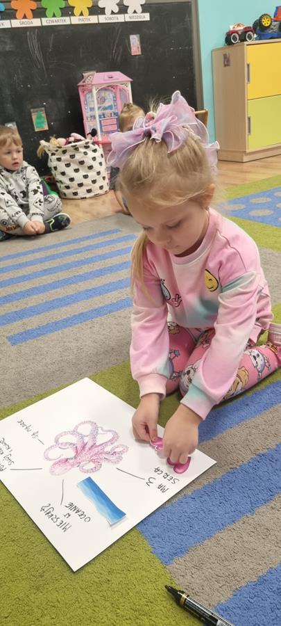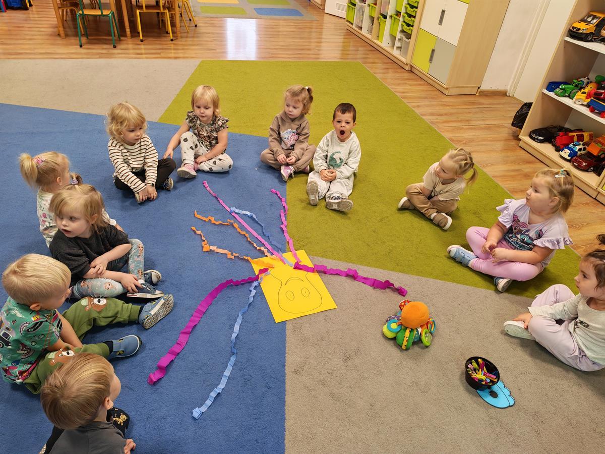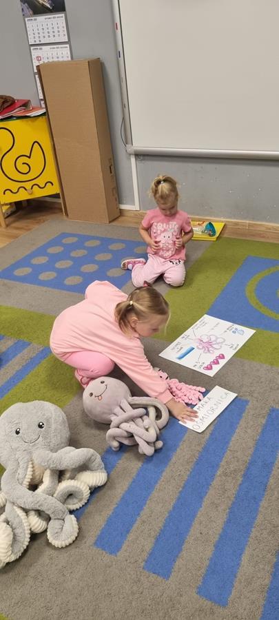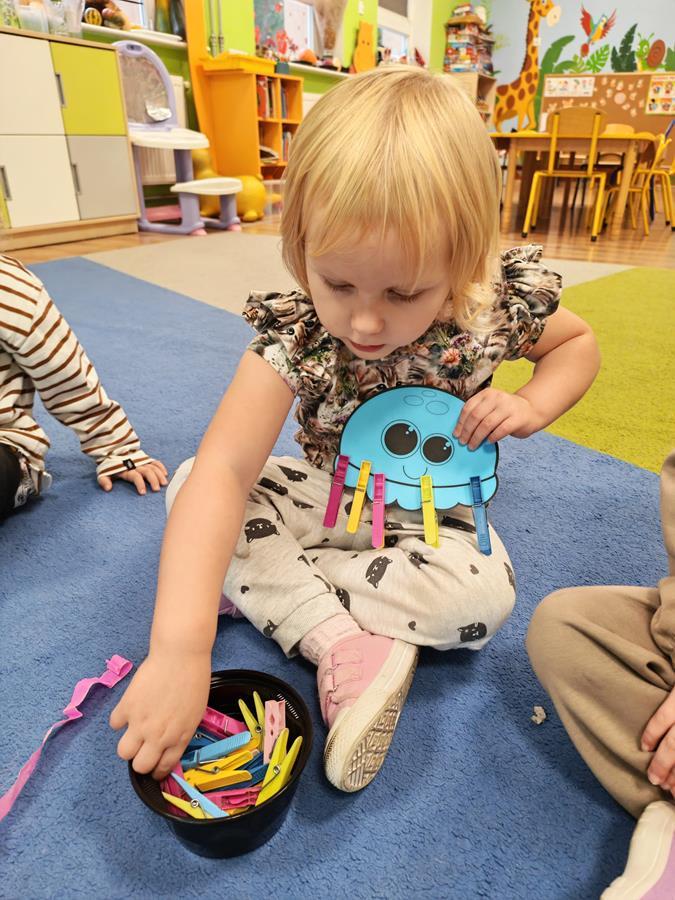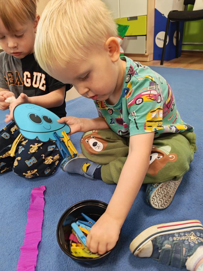 Nie zabrakło także zabaw ruchowych i muzycznych – przedszkolaki z entuzjazmem słuchały i śpiewały piosenki o ośmiornicy, a także uczestniczyły w zabawach z klamerkami, które rozwijały sprawność manualną oraz koordynację.