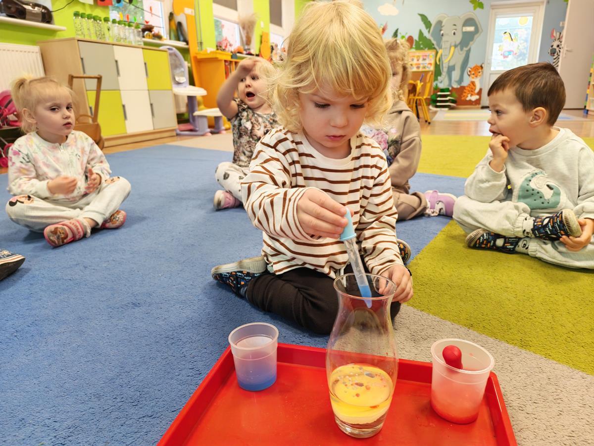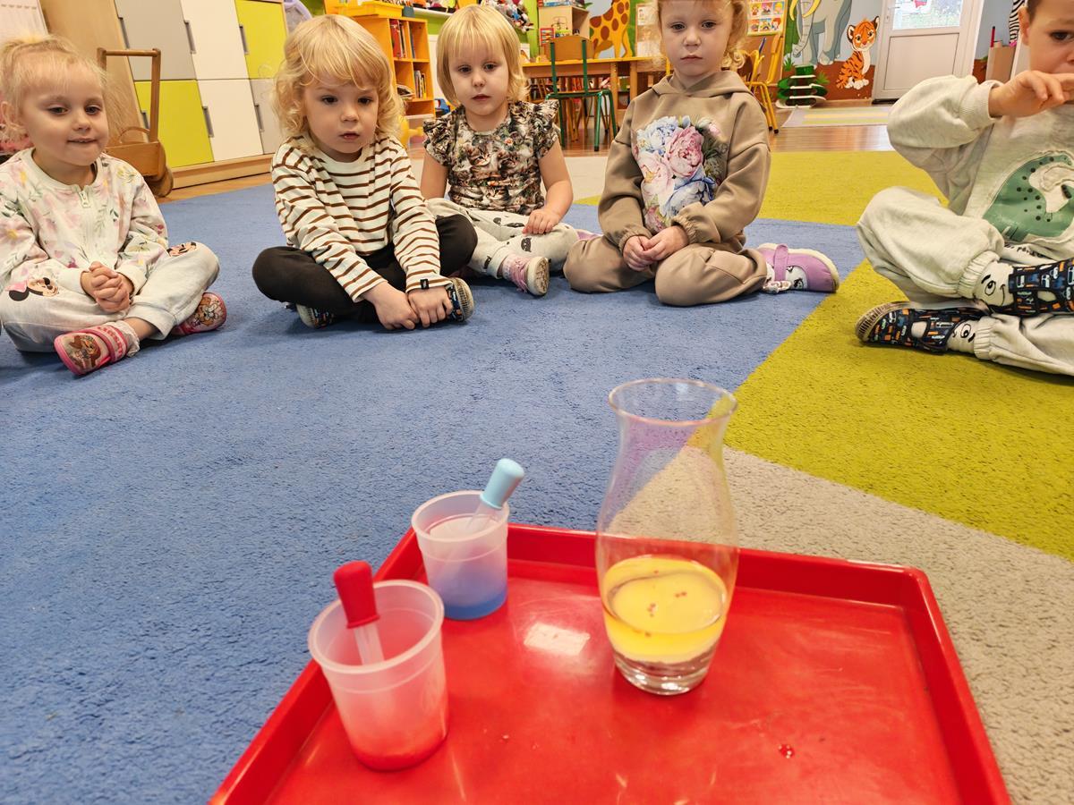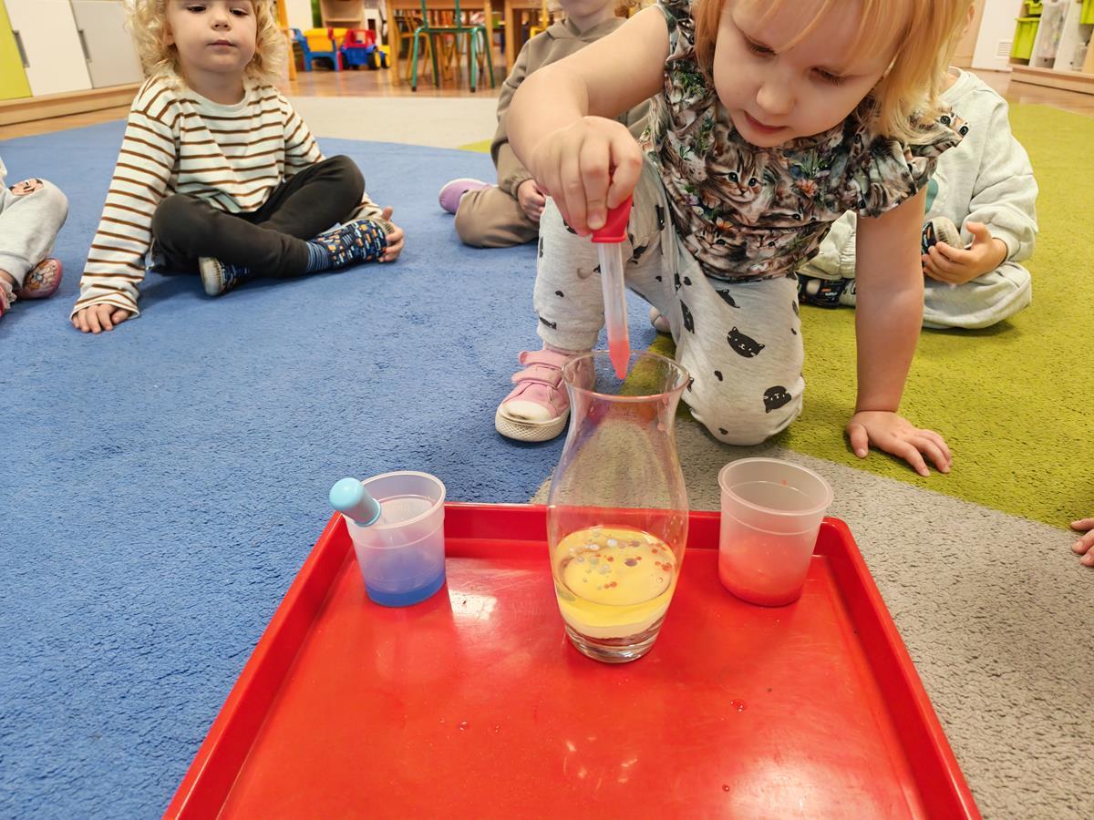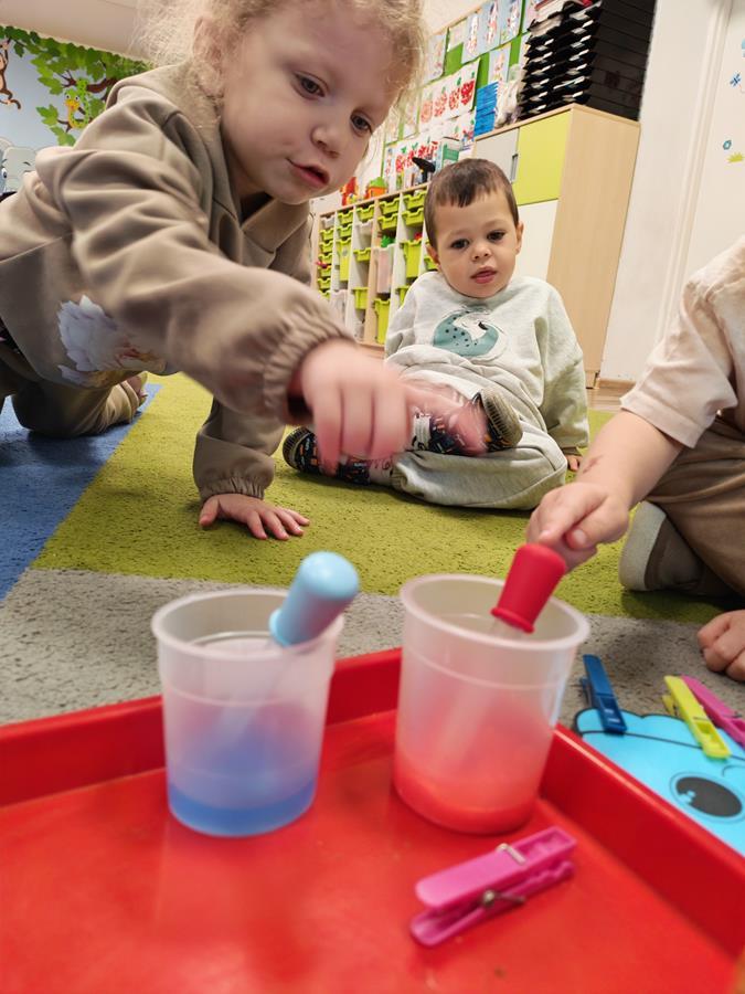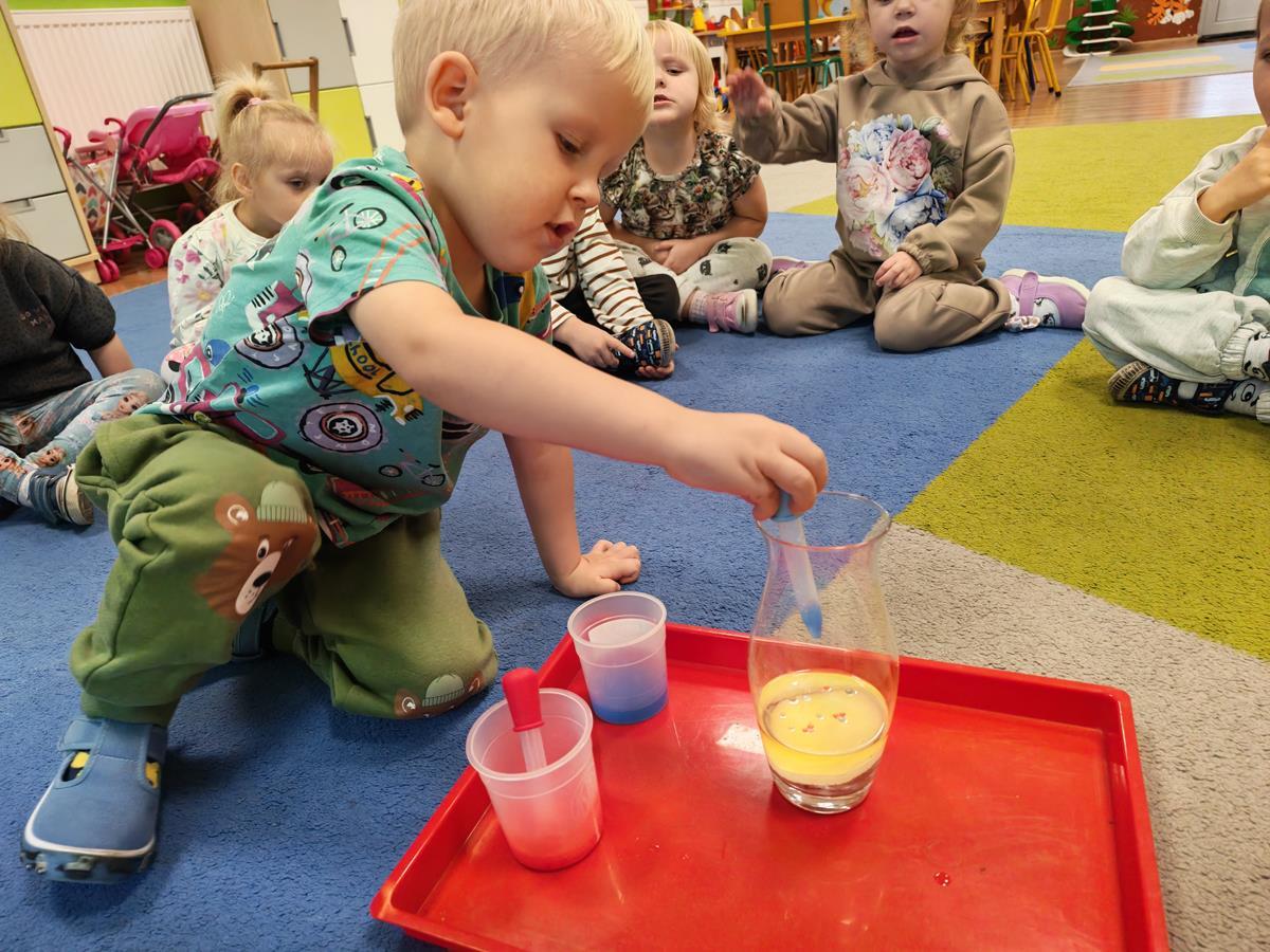 Mieszanie barw – dzieci uczyły się, jak powstają nowe kolory, mieszając podstawowe barwy.