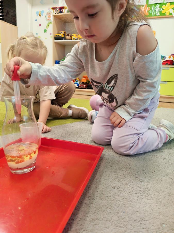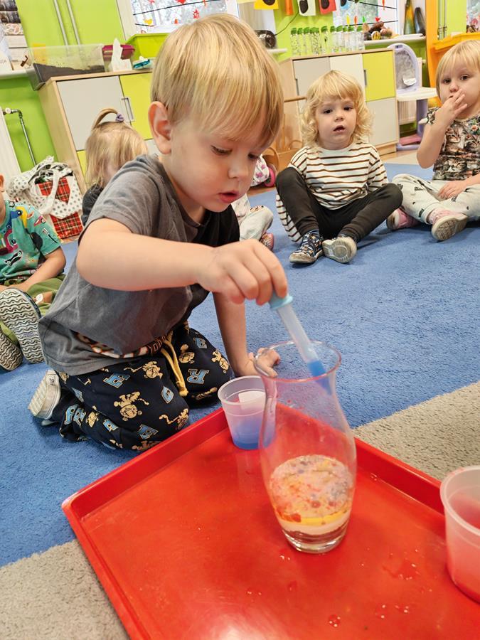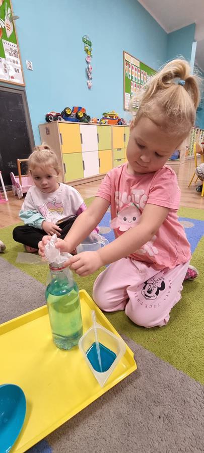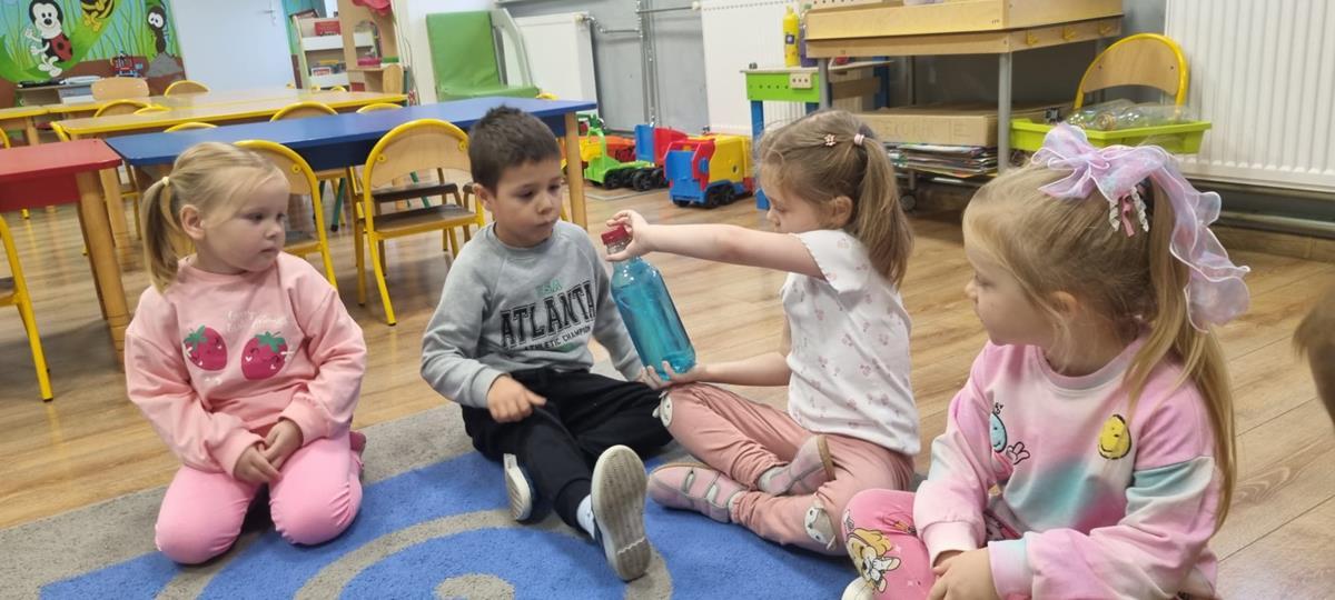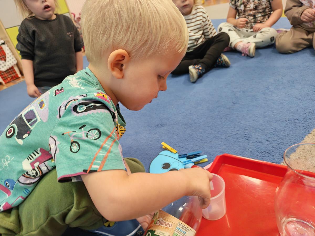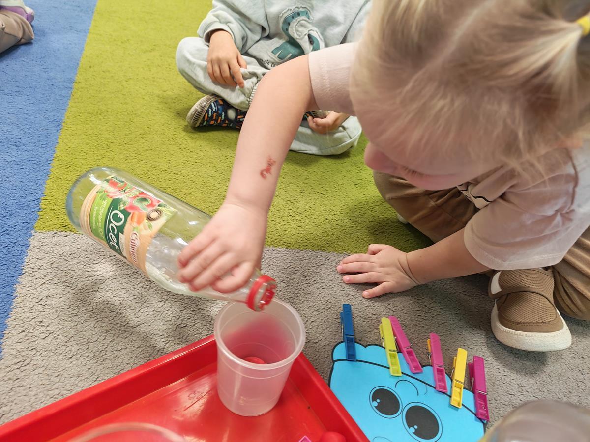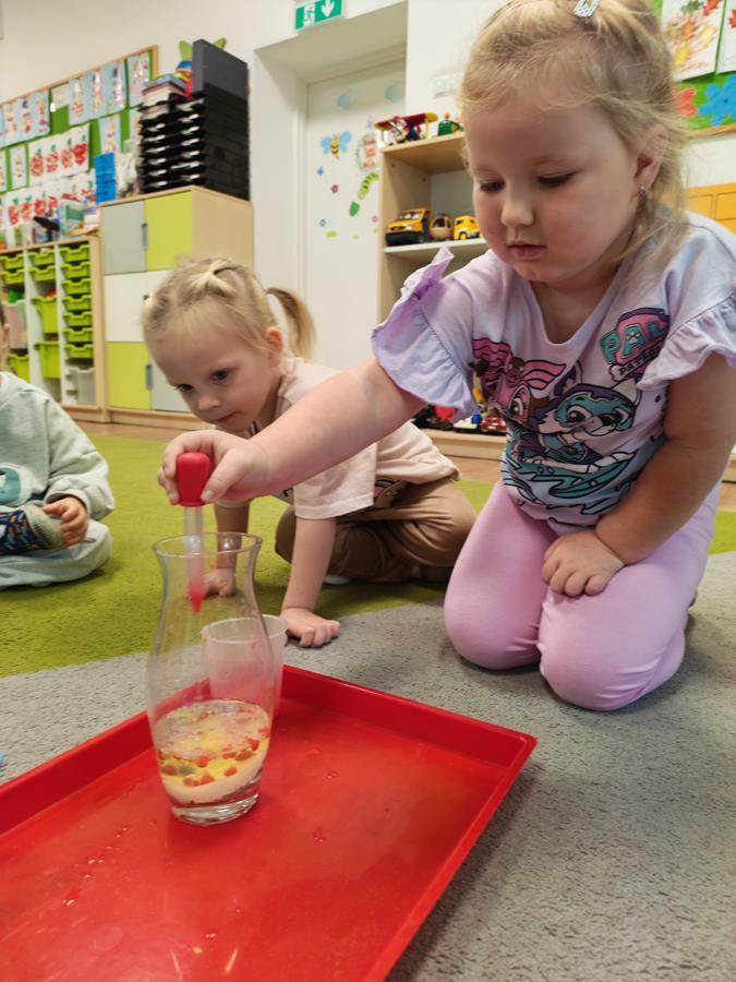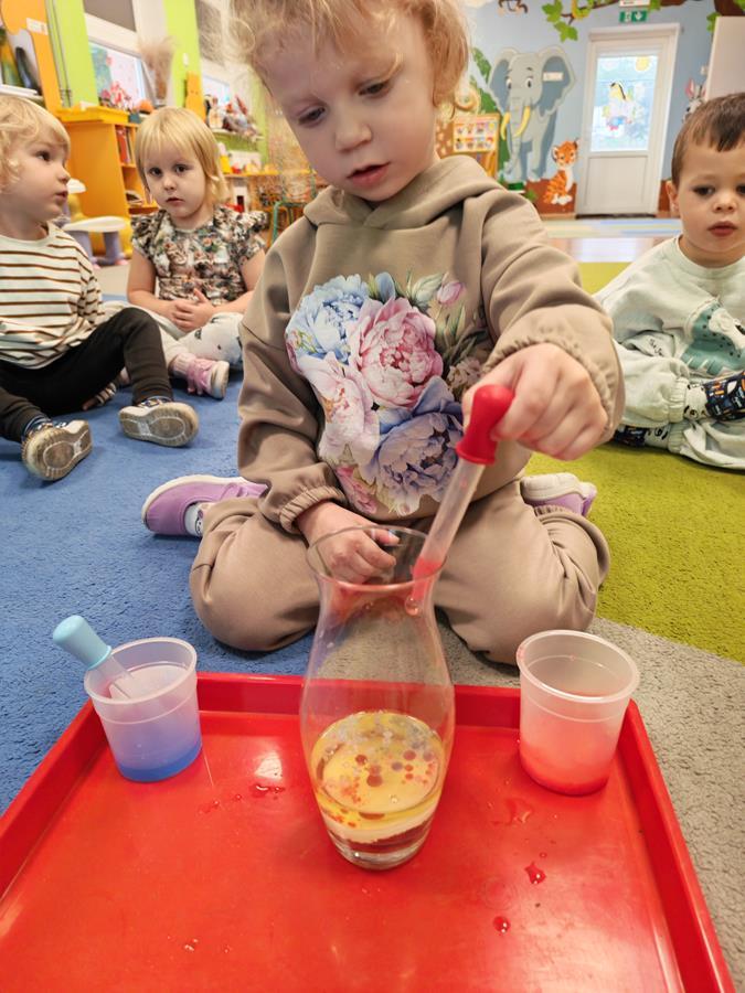 Mieszanie barw – dzieci uczyły się, jak powstają nowe kolory, mieszając podstawowe barwy.