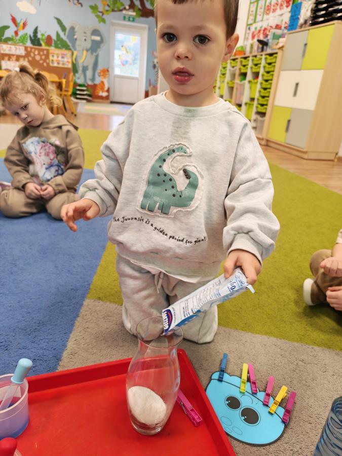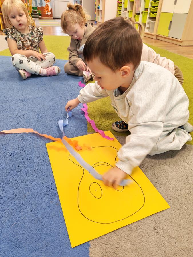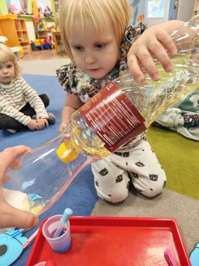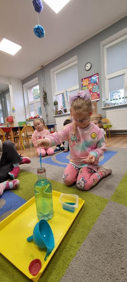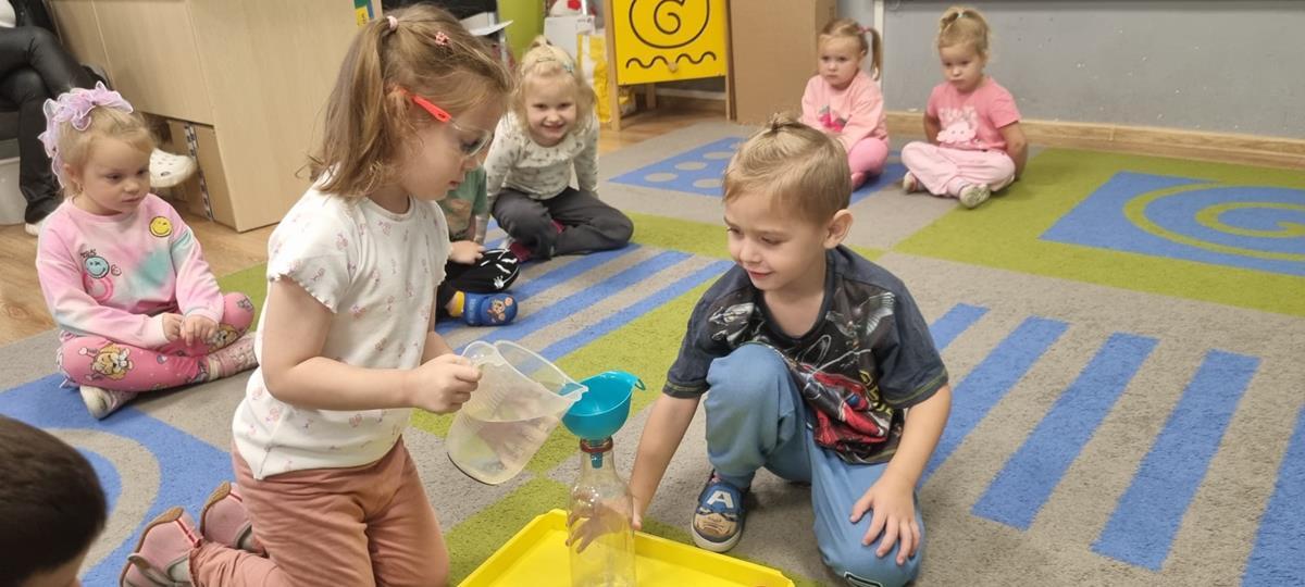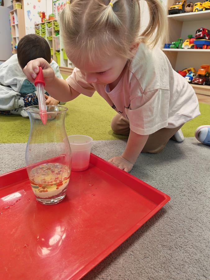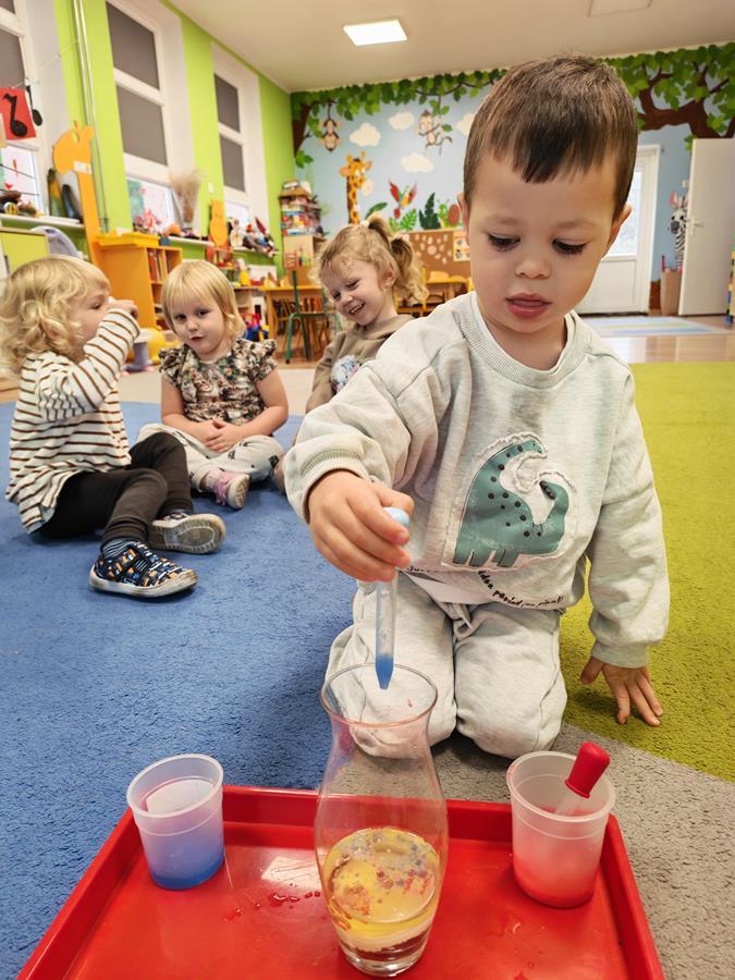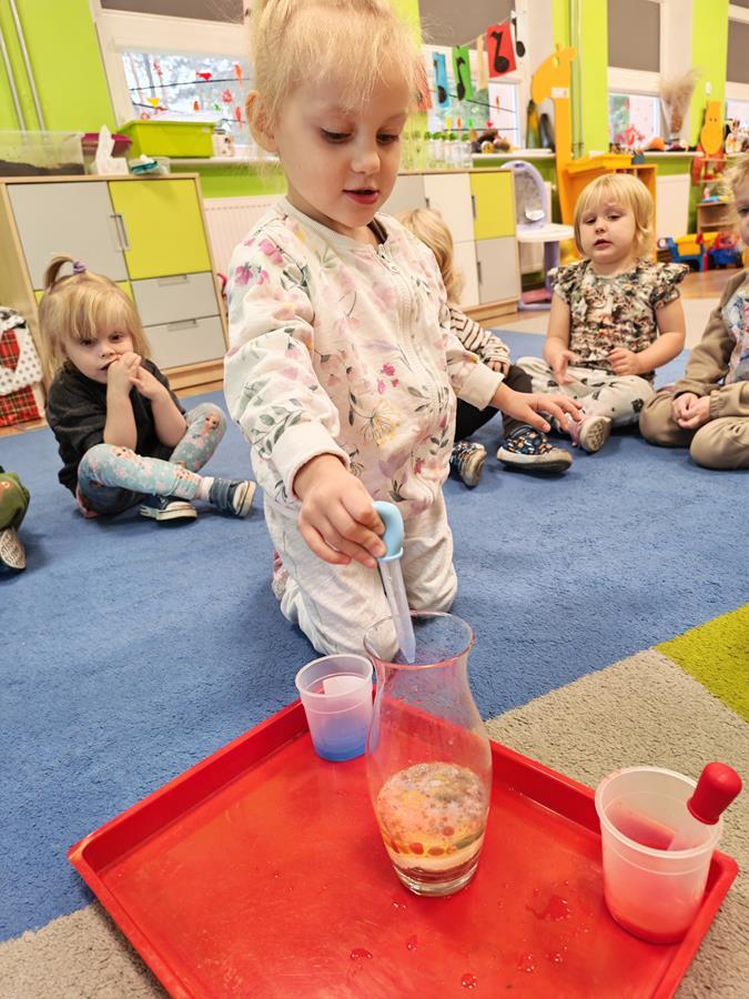 Mieszanie barw – dzieci uczyły się, jak powstają nowe kolory, mieszając podstawowe barwy.