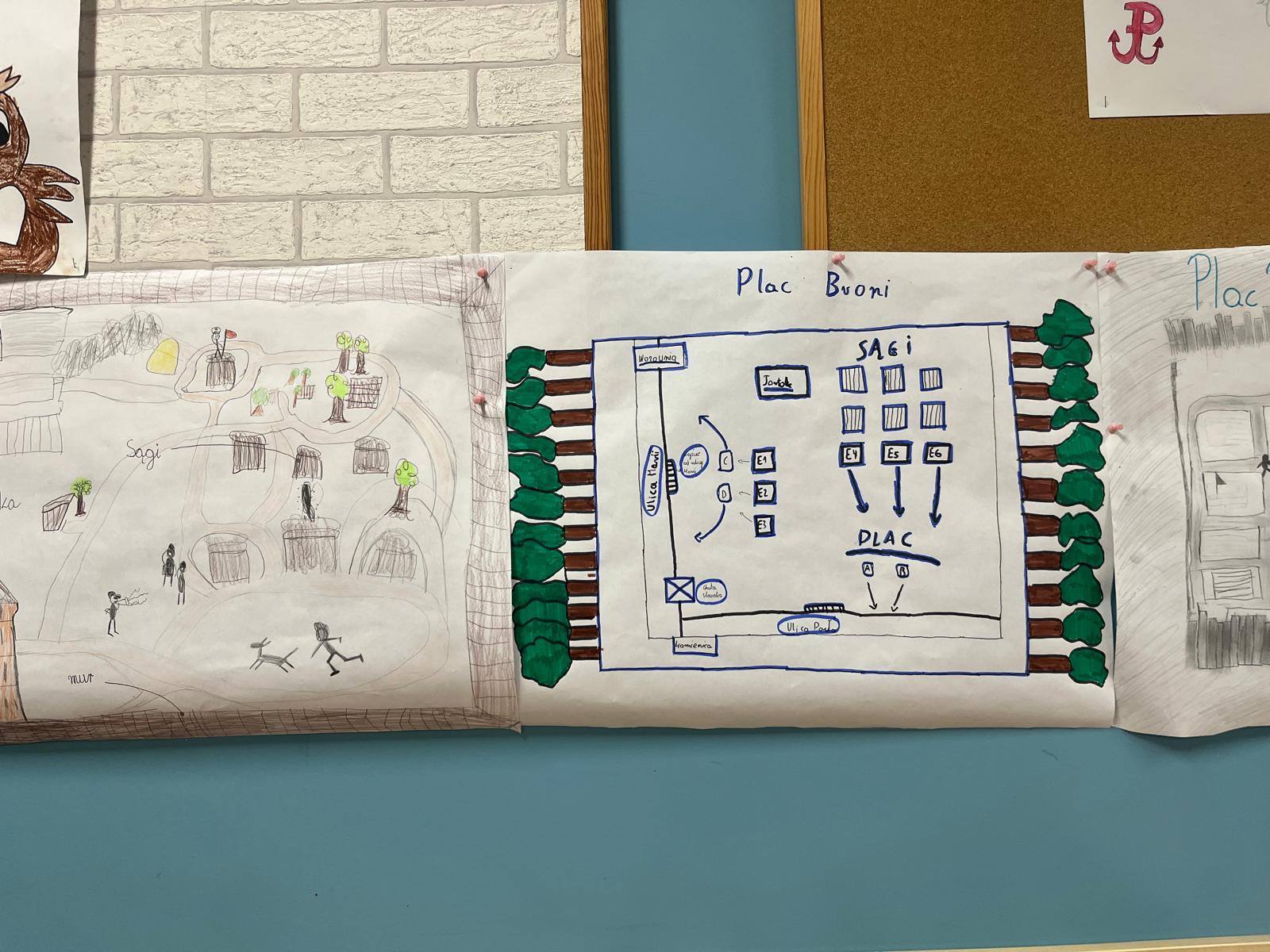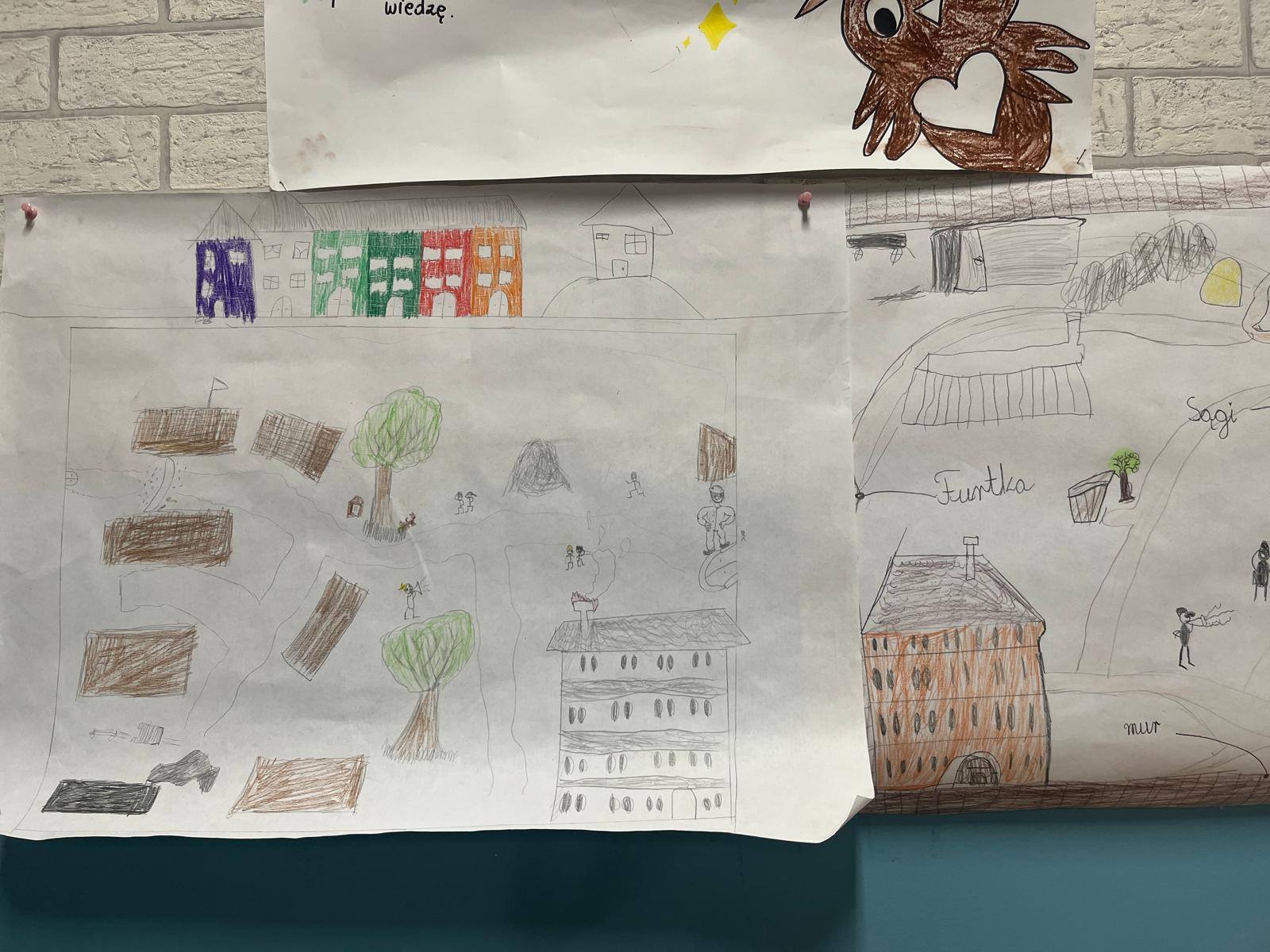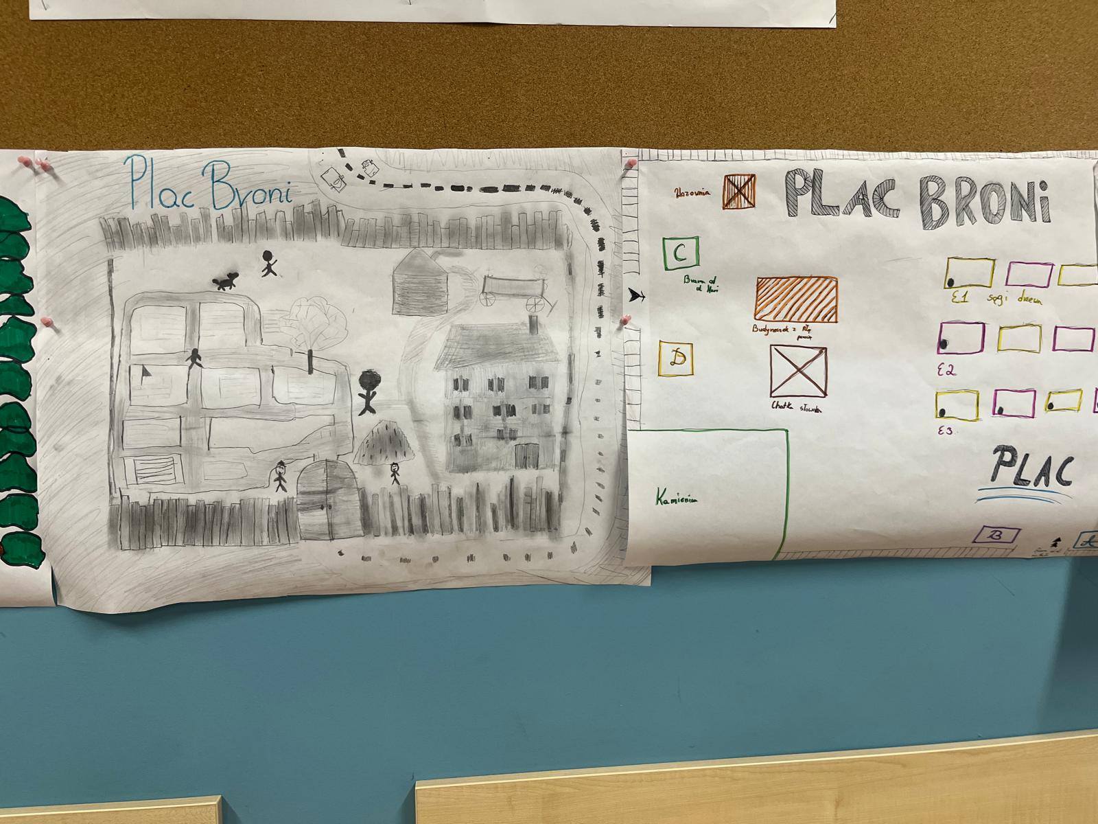Następnie pracowaliśmy w grupach, wykonując plakaty przedstawiające Plac Broni – miejsce będące centrum wydarzeń w książce. Każda grupa pokazała swoją pracę, omawiając, jak wyobraża sobie to miejsce i dlaczego wybrała takie elementy do przedstawienia na plakacie. Zadanie pozwoliło utrwalić treść lektury oraz rozwijało naszą współpracę i kreatywność.