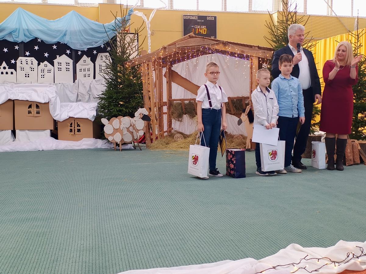 Nasze widowisko 5 stycznia oglądała cała społeczność szkolna oraz zaproszeni goście – wójt Gminy Szczecinek – Pan Ryszard Jasionas, Rodzice oraz uczestnicy Środowiskowego Domu Samopomocy w Turowie. Po uroczystości zostały wręczone nagrody przez Pana Wójta za udział w gminnym konkursie „Bombka świąteczna” oraz nagrody za organizowany przez Radę Rodziców konkurs „Ptasi Bufet”.