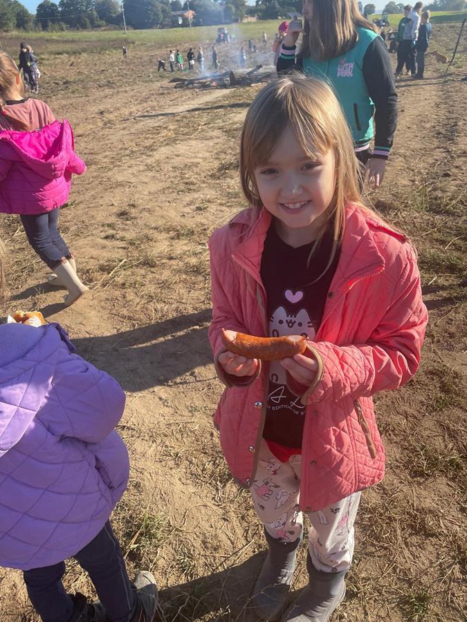 Po zajęciach w polu czekało na wszystkich wielkie ognisko. Pieczone kiełbaski, bułeczki, babeczki, ciasto, a do tego kawa, herbata i – obowiązkowo – pieczone ziemniaki smakowały lepiej niż najlepsza restauracja. Kto chciał, mógł nawet sprawdzić, czy ziemniak z ogniska smakuje tak samo dobrze jak ten, który samemu zebrał – opinie były jednogłośne: pycha!